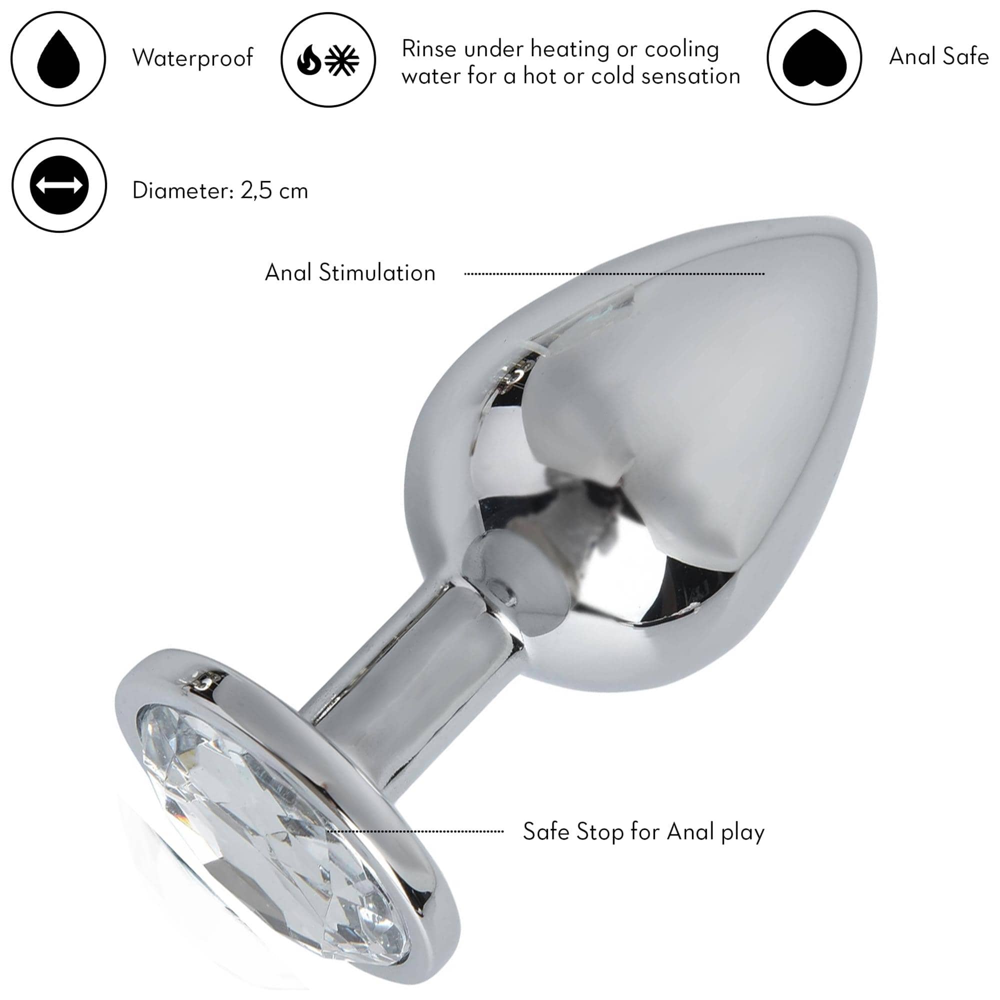 Alla Pleasure Steel Plug har ett säkert stopp i botten – utformat som en rund, dekorativ kristall – som förhindrar att pluggen glider för långt in. Det gör leken både trygg och skön, oavsett om du använder den: